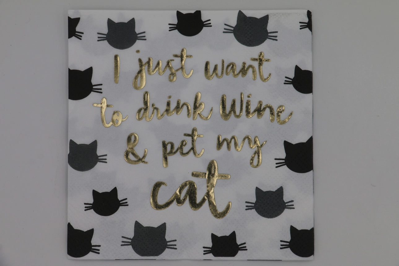 These humor themed gold foil paper cocktail napkins are perfect for tabletop decoration and add a touch of humor to any occasion.  Great gift for any wine and cat loving hostess, friend, family member or coworker.