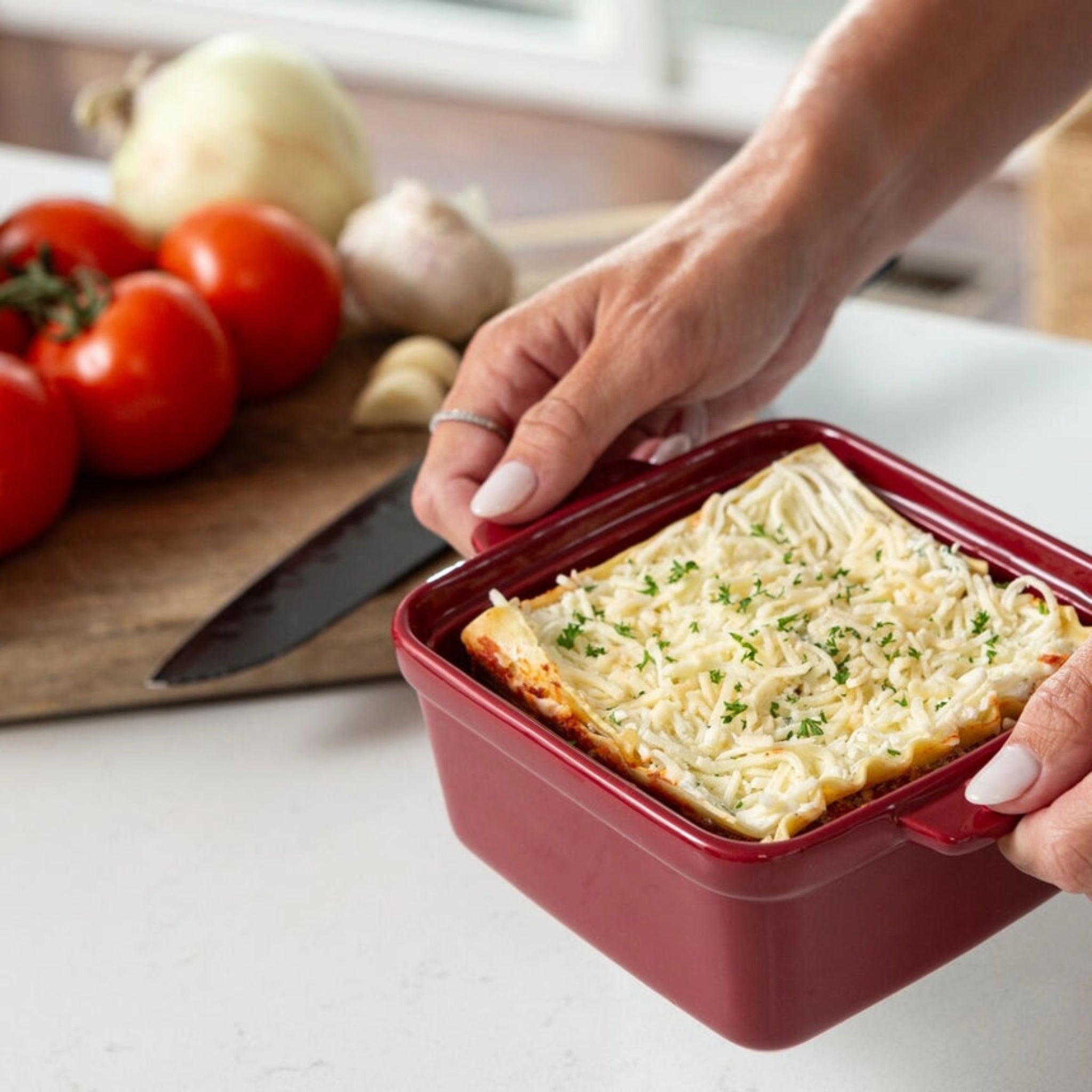 The Souper Cubes 5" square and rectangle ceramic baking dishes with silicone covers are perfect for baking or serving smaller portions of food. Each baking dish is designed to fit food previously frozen in Souper Cubes freeze trays. The square baking dish fits 2-cup frozen cubes or 2 1-cup frozen cubes. Silicone covers allow you to store food in the refrigerator with a snug fitting clear covering.