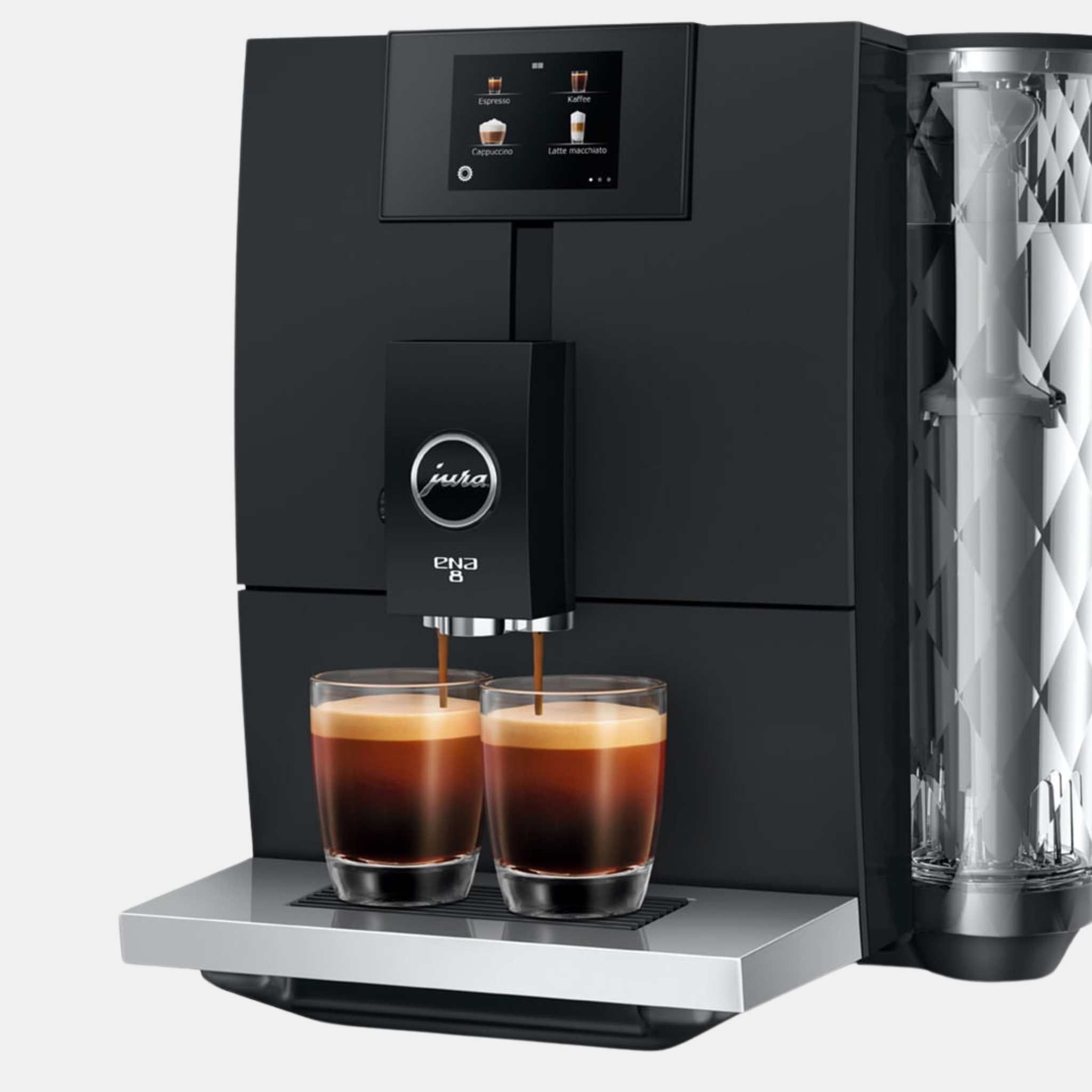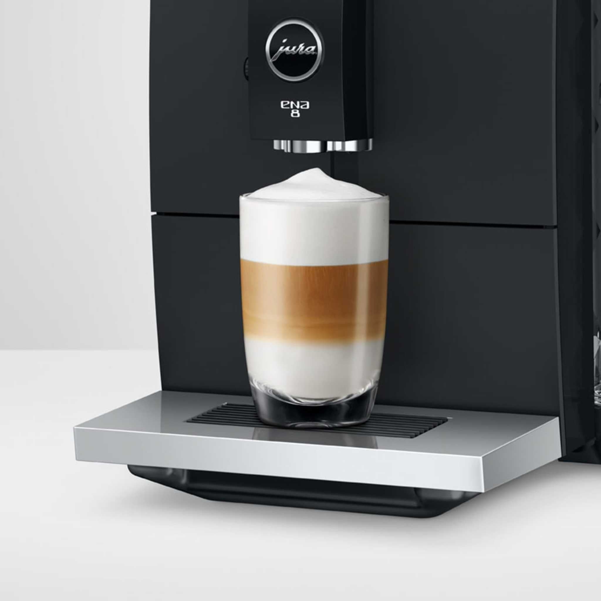 Measuring a mere 10.7 × 12.7 × 17.5 in, the ENA 8 boasts a compact footprint that fits seamlessly into any kitchen. Despite its small size, this machine delivers uncompromising JURA quality in both coffee and design. The minimalist aesthetic, featuring clean lines, premium materials, and elegant accents like the chrome-plated cup tray and crystal-clear water tank, appeals to those who value both style and exceptional coffee.