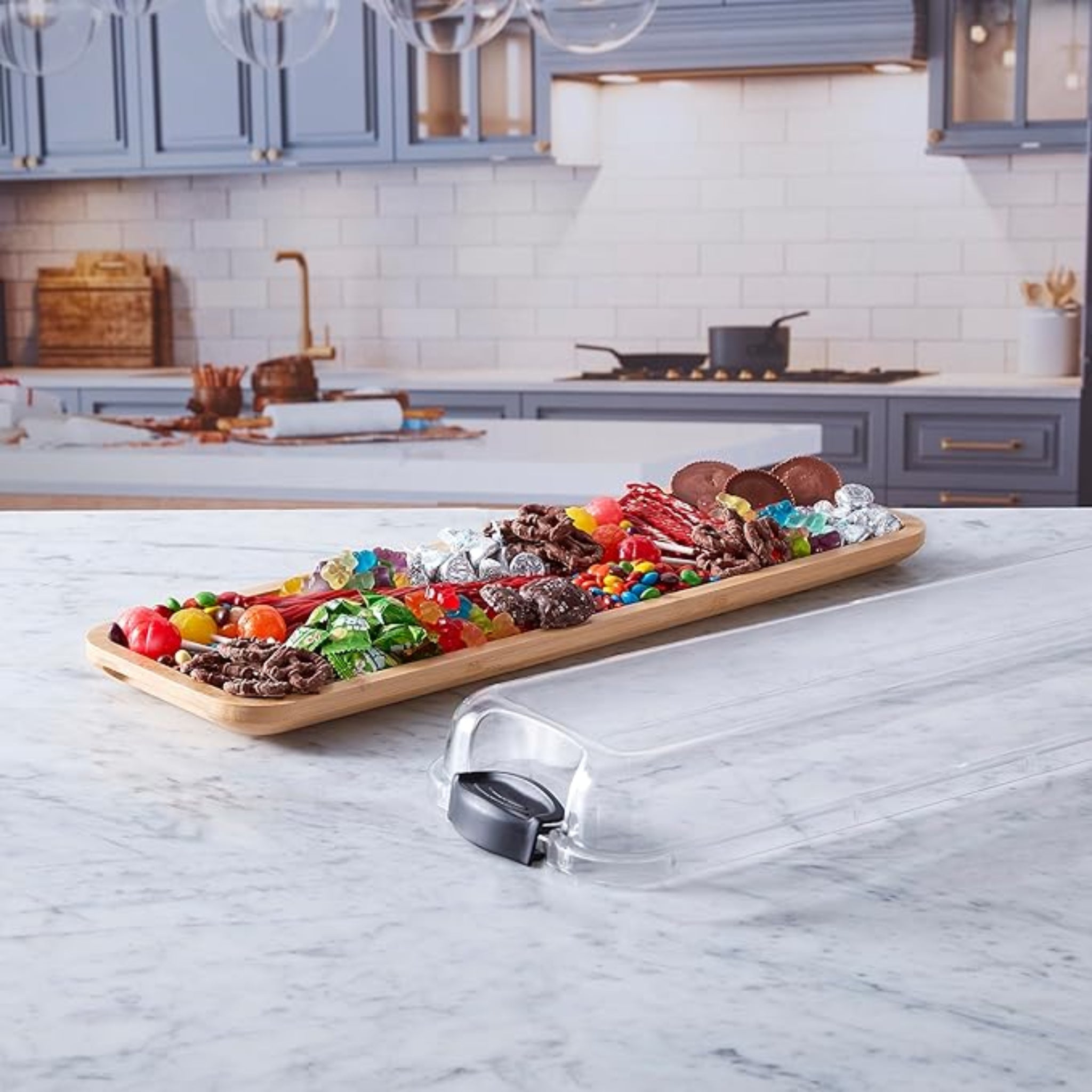 The practical locking plastic storage lid provides food freshness and security, making transporting your charcuterie board effortless.
